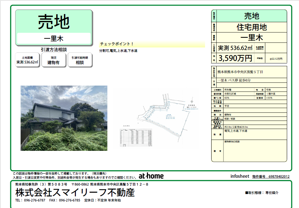 黒髪5丁目の住宅街の162.32坪の土地です!古家有 黒髪小学校・桜山中学校校区 セットバック後有効面積515.76㎡(156.01坪、坪23万円) 隣地境界線立会い済、測量渡し(実測売買)